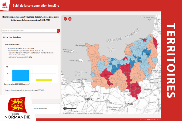 Cette application présente la consommation foncière normande entre 2011 et 2020 par intercommunalité à l’échelle régionale et à la parcelle à l’échelle intercommunale. Elle mobilise la donnée de la Cartographie de la consommation foncière (CCF) produite par l’Établissement public foncier de Normandie et la Région Normandie. La surface consommée entre 2011 et 2020 en ha = total colonne SURF_CONSO (converti en ha) des couches "conso_bati" et "conso_non_bati" de la base CCF. Attention : Pour les intercommunalités à cheval sur d'autres régions, les indicateurs ne sont calculés que sur les communes normandes.